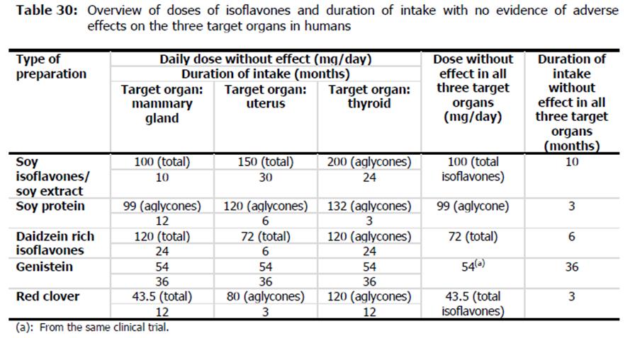 due to wide variability in organ functions, receptor density and effects of receptor activation and differences between individual isoflavone effects and activity, efsa did not consider it appropriate to read-across results between different organ sites or extrapolate results from one isoflavone to another. that is why efsa was unable to derive single health-based guidance value or a safe intake level for food supplements containing isoflavones as a group. however, in comparing the highest doses evaluated without adverse effects in the 3 key organs and the longest duration of intake for the individual isoflavones, efsa did suggest dose and durations that could be considered as guidelines (see efsa's summary table below).